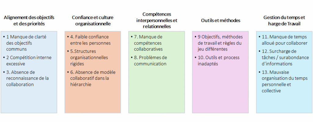 Or les problèmes de collaboration n’ont pas tous la même cause. Des équipes qui ne coopèrent pas parce qu’elles n’ont pas confiance les unes dans les autres ne bénéficieront pas des mêmes interventions que des équipes qui ne coopèrent pas parce que leurs objectifs sont contradictoires, ou parce qu’elles n’ont pas les outils adaptés, ou parce que leurs managers ne leur en donnent pas les moyens.
