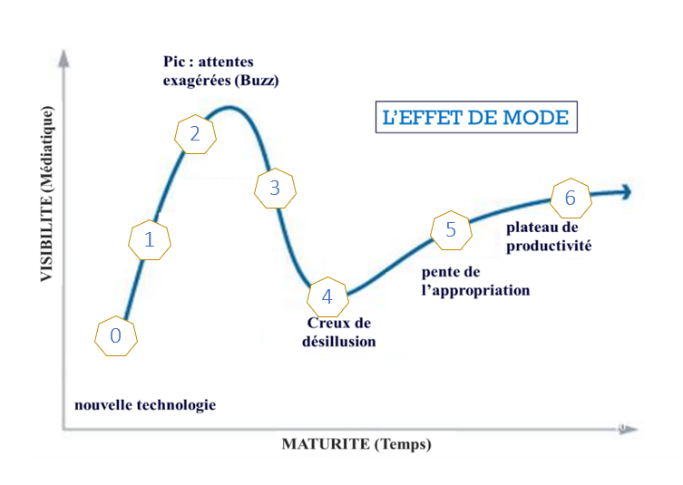 Le cycle de Gartner le décrit bien. Étape 0 : ça n’existe pas. Étape 1 : on commence à en parler. Étape 2 : c’est génial, c’est la solution à tout. Étape 3 : hm, c’est bien mais quand même. Étape 4 : ça ne sert à rien. Étape 5 : dans certaines conditions, bien utilisé, c’est efficace. Étape 6 : c’est un outil parmi d’autres.